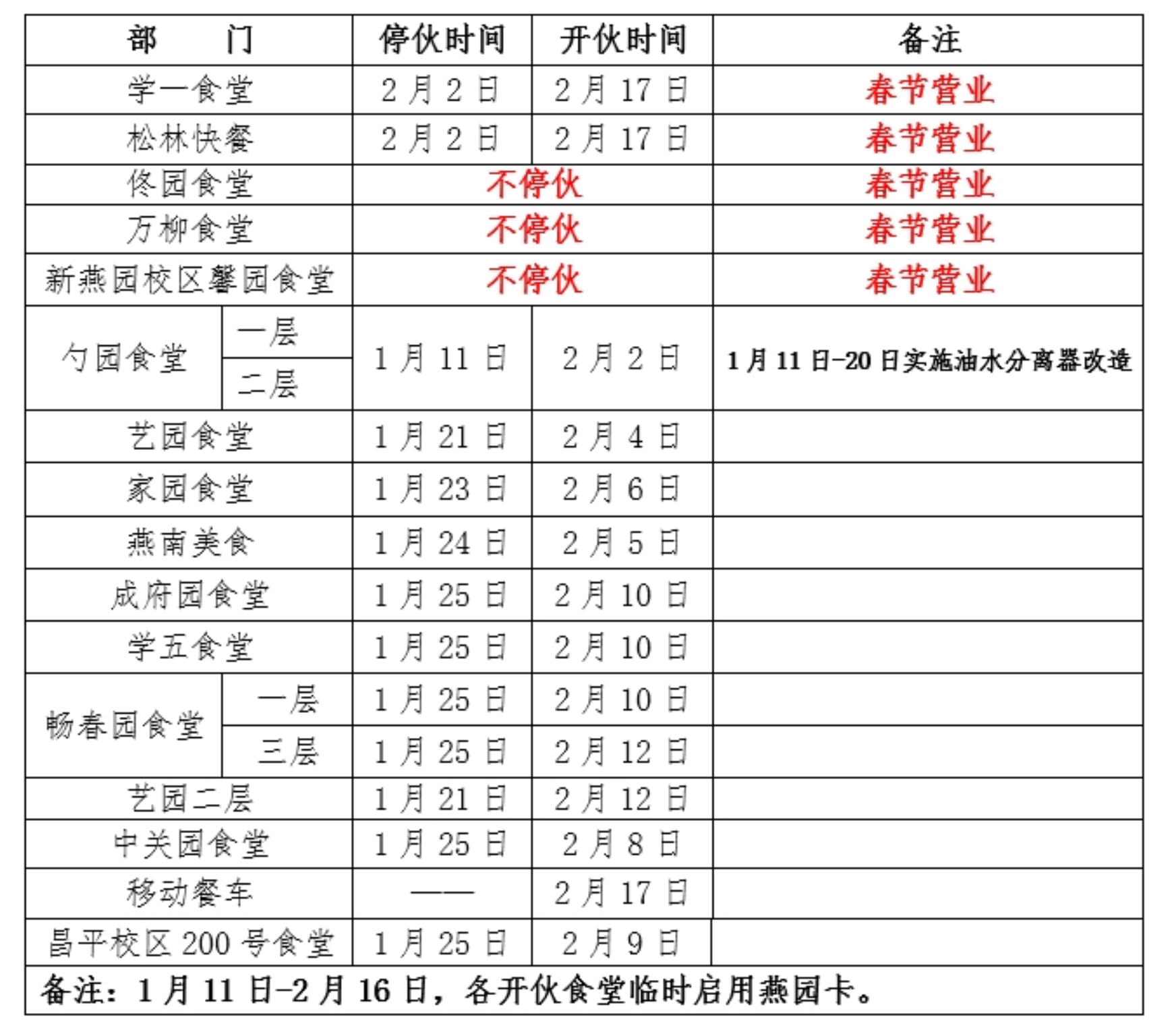 三、假期各食堂开放时间