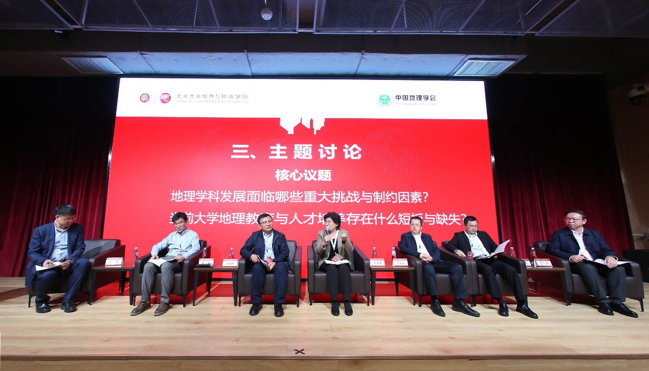 主题讨论环节,北京联合大学应用文理学院院长张宝秀、华南师范大学地理科学学院院长刘云刚、福建师范大学地理科学学院院长吴福忠、西北师范大学地理与环境科学学院院长马利邦、四川师范大学地理与资源科学学院院长彭立、中国地质大学(武汉)地理与信息工程学院副院长王伦澈围绕“地理学科发展面临的重大挑战与制约因素”和“当前大学地理教育与人才培养存在的短板与缺失”两大议题进行了分享交流。讨论指出当前地理学科在发展中存在的研究综合性较弱、主体引领性不足、人才培养体系不够健全、学科影响力仍有待提升等问题,提出地理学学科发展与人才培养应基于不同学院的传统与特色,围绕服务国家需求和提升学科影响力的两大共同目标,注重学科基础、关注文化转向,在合作中凝聚力量,在传承中共同发展。