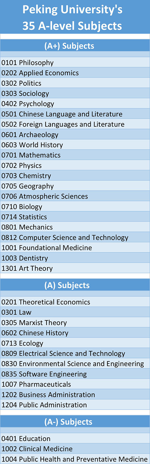 Of the 50 primary subjects at Peking University, 35 of them were ranked as A-level (A+, A, A-) subjects. At 70%, PKU has the highest proportion of A-level subjects in the country. Altogether, PKU scored 21 A+ subjects, 11 A subjects, and 3 A- subjects for a total of 35 subjects. With 21 A+ subjects, PKU is tied for first in the country.