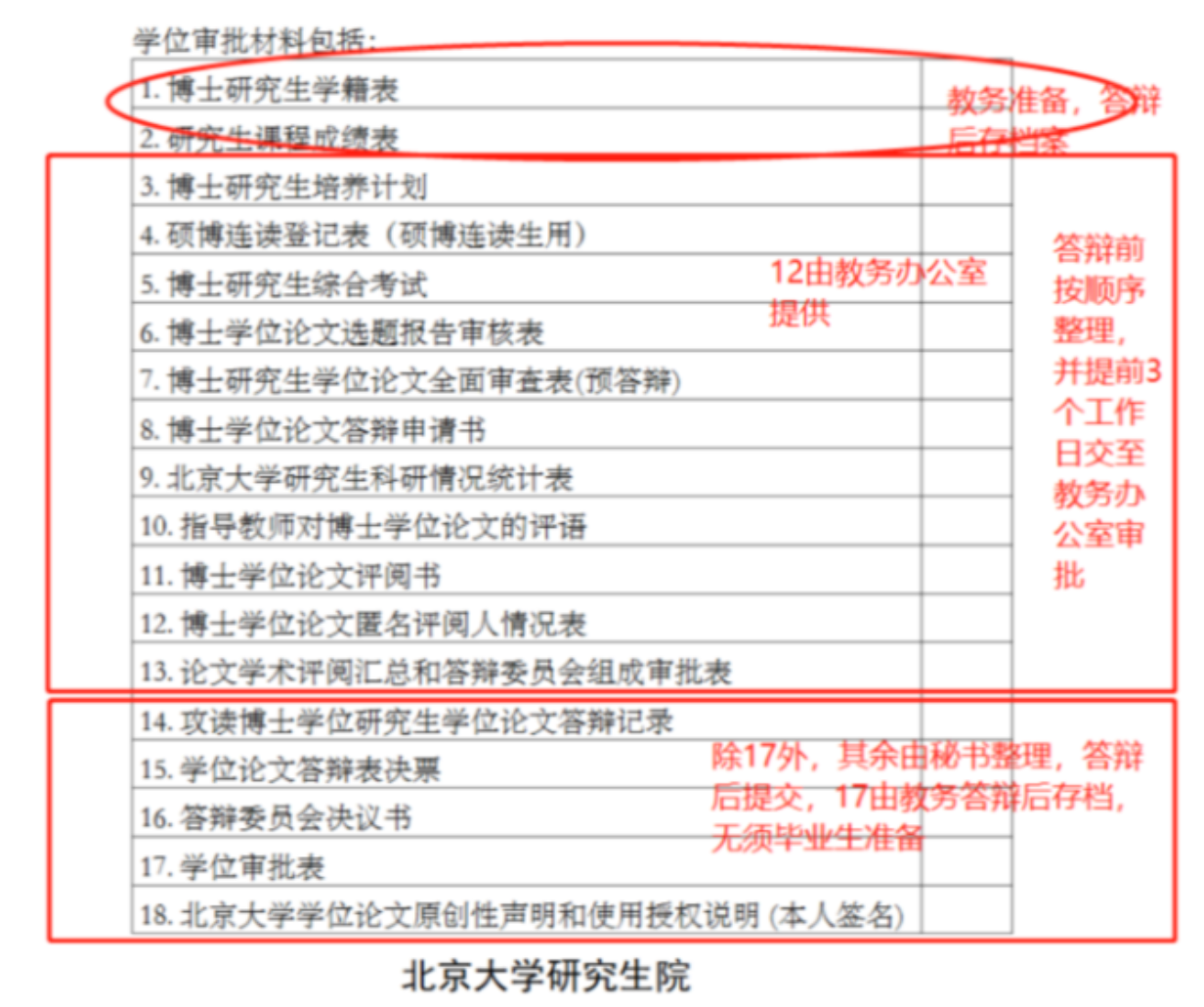 注意:答辩材料按照学位审批表A、B封面清单进行准备(详细要求请见:http://www.ues.pku.edu.cn/jyjx/yjsjxw/zlxz/324609.htm),所需材料均需要通过“校内门户”-“研究生院业务”相关模块打印。其中匿名评阅人情况表由研究生教务办公室负责制作。学籍表、成绩单和匿名评阅人情况表由研究生教务办公室负责提供,无需领取,毕业存档时由教务办公室统一放入档案。