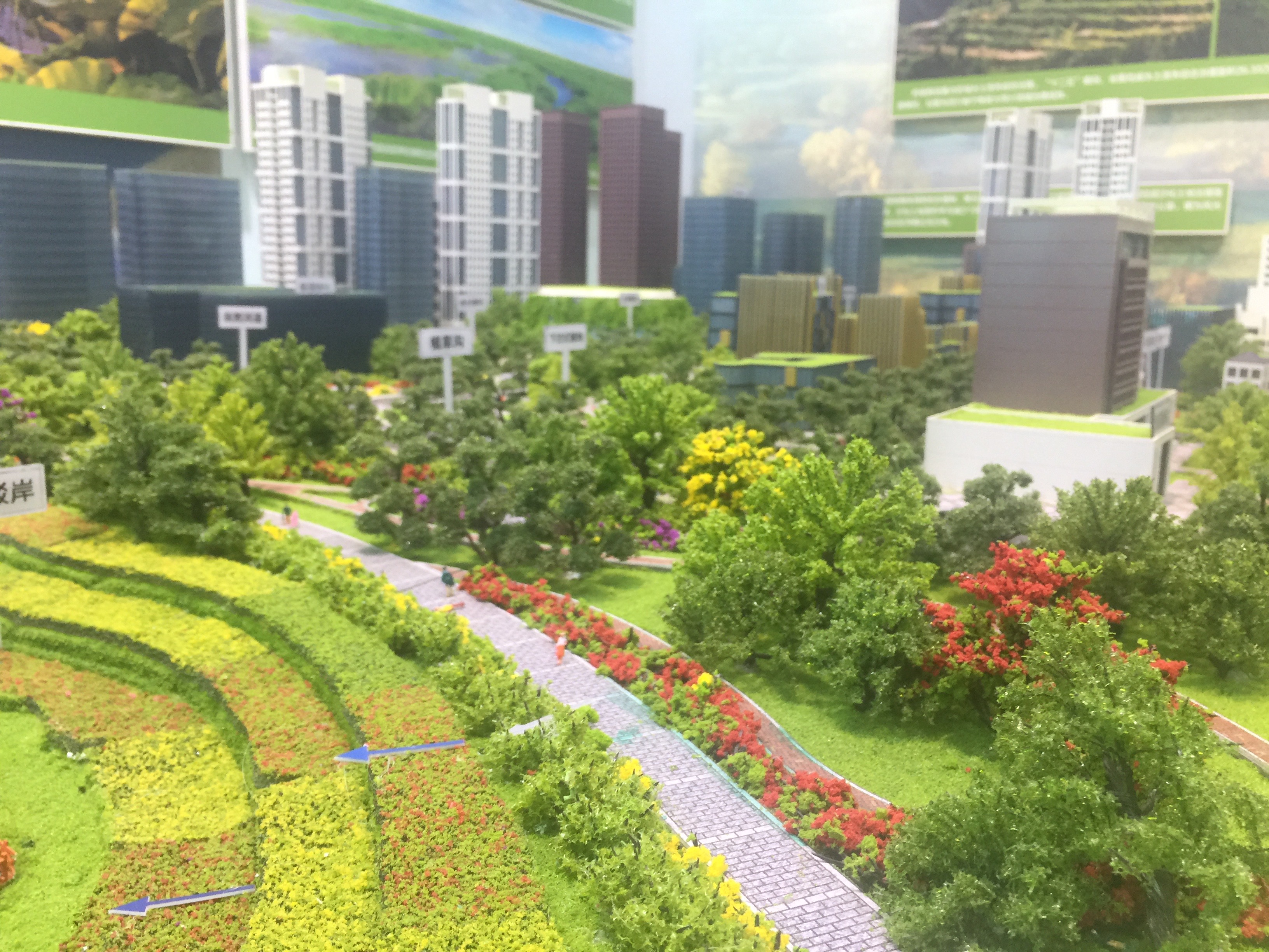 身为城市规划专业方向的学生,在众多展区中,我们最关注的是与城市发展相关的内容。在生态文明展区中,有一个关于海绵城市建设的展示沙盘非常醒目。在景观课上,我们学到许多与海绵城市相关的专业知识,比如源头处理、终端处理等对策,植草沟、雨水花园、干井、下渗地砖、绿色屋顶等生态手法。这些都在这块沙盘上一一呈现,勾画出一个耦合雨洪管理与游憩需求,能实现修复城市水生态、改善水环境、涵养水资源、保障水安全等目标的城市。
