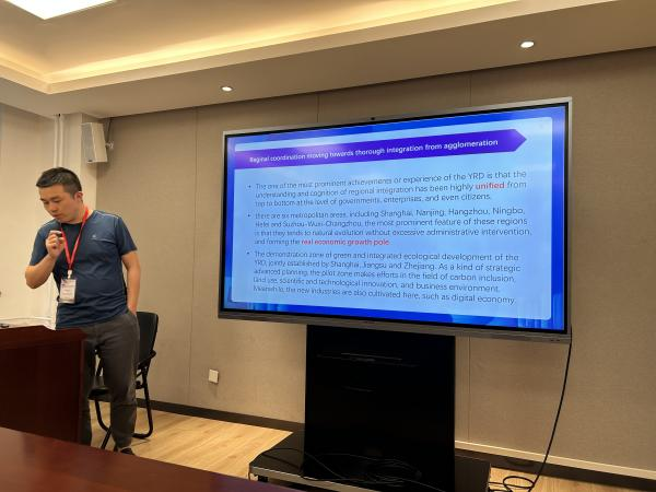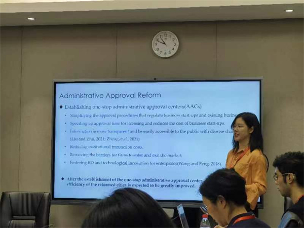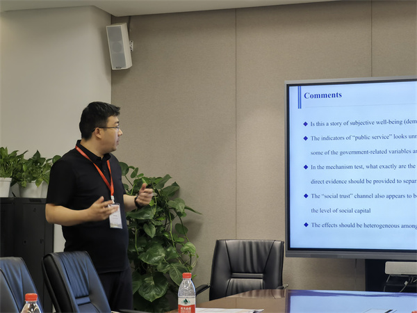 分会场14围绕“政策”这一主题展开,作为本次分论坛的主席,来自湖南大学的华博士首先介绍了汇报人以及评议人。接着,他做了关于有关西部大开发带来财政压力与公共产品供给不足的汇报。之后,来自北京大学的博士候选人盛涵天同学汇报了有关疫情对区域产业动态及城市经济韧性影响的研究。在简短的休息后,来自苏州大学的张博士和来自上海财经大学的李博士分别就中国行政改革能否促进出口扩展以及城市边界扩展对居民满意度以及公共品供给的影响等问题进行研究汇报。