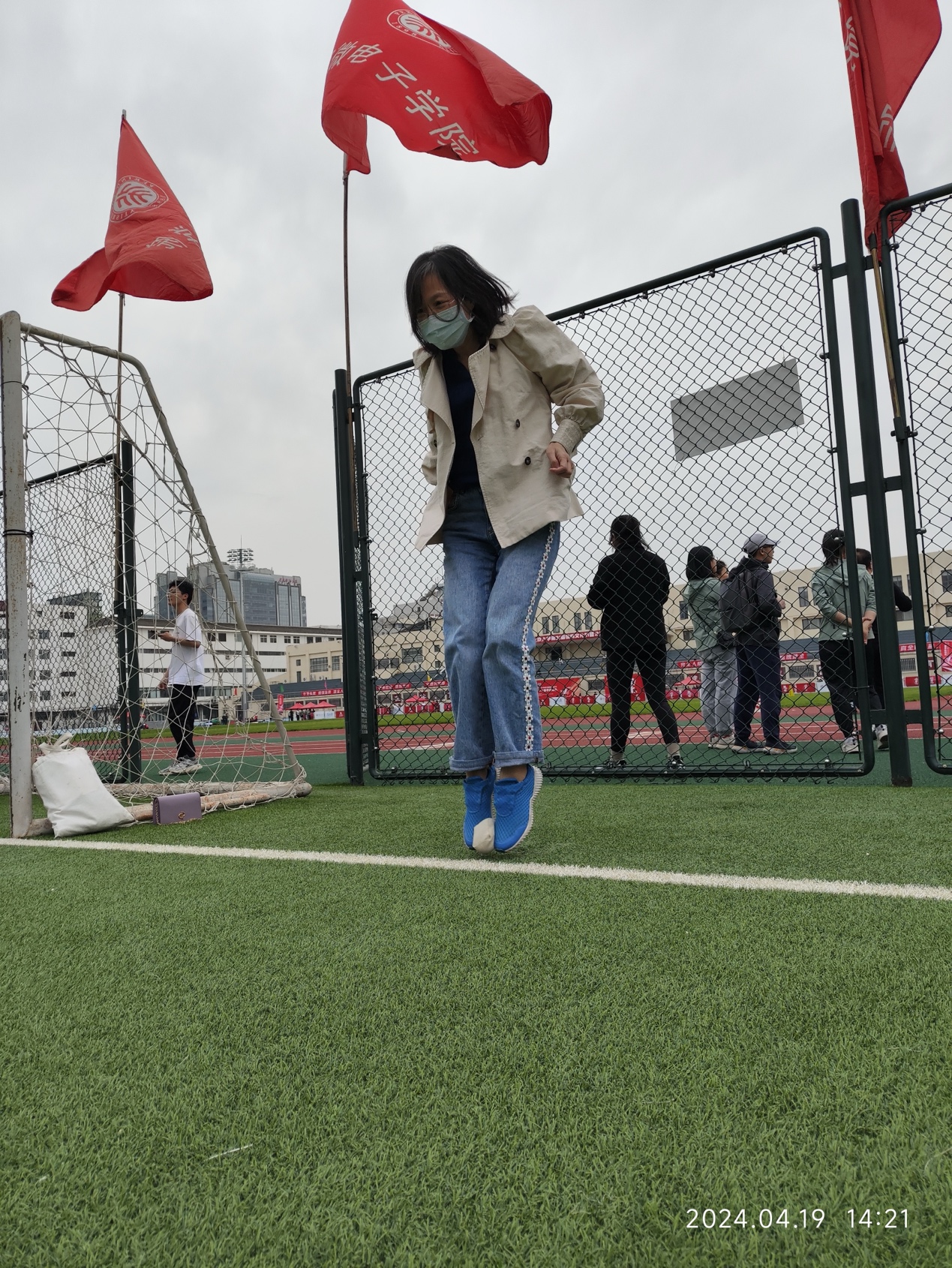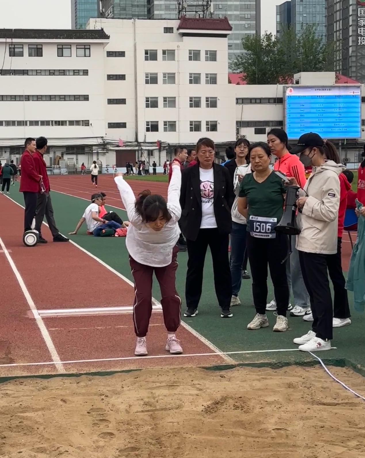 朱江玲老师获得女子C组立定跳远三连冠,并再次打破了自己保持的学校纪录;