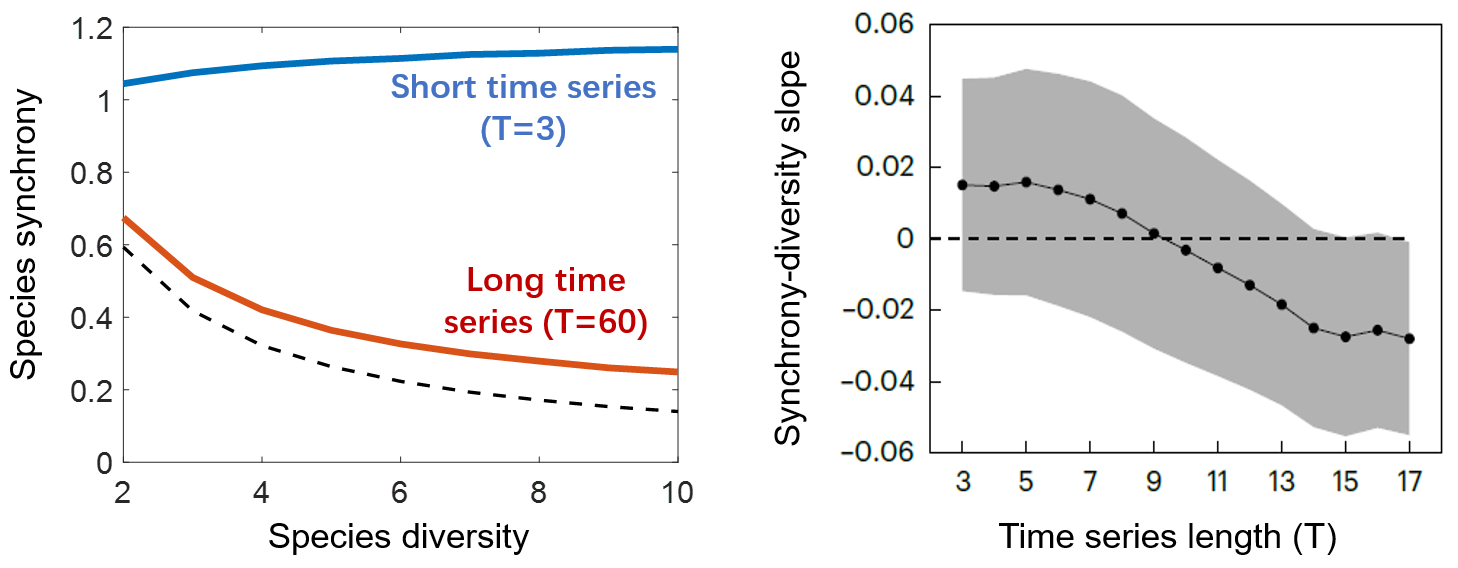 图2. 时间序列长度对物种同步性-多样性关系的影响
