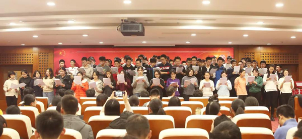 接下来,贺灿飞宣读了学院对重大活动参与师生的嘉奖令,刘耕年、贺灿飞、石长翼、陈耀华、张新平、李晓瑭为师生颁奖。之后,2019级本科新生合唱一首《国家》,全体与会成员齐唱《同心共筑中国梦》,以歌声表达对祖国深沉的爱,向祖国献礼。现场仿佛回到了重大活动当日,同学们激动地挥舞起手中的红旗,“团结起来,振兴中华”的口号响彻会场。